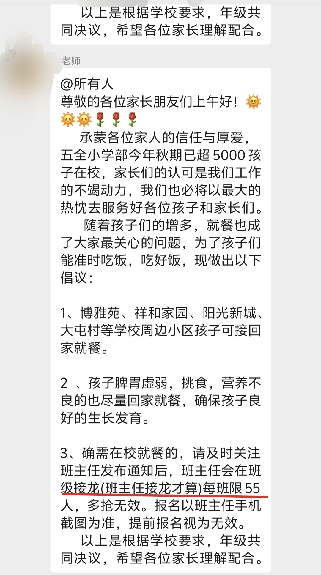 彭先生提供的一张学校群发的见告暴露,“五全小学部本年秋期已超5000名孩子在校,跟着孩子们的增多,就餐也成了人人最柔和的问题,为了孩子们能准时吃饭,吃好饭,作念出以下倡议:1、博雅苑、平和家园、阳光新城大屯村等学校临近小区孩子可接回家就餐。2、孩子脾胃朽迈,挑食,养分不良的也尽量回家就餐,确保孩子邃密的滋长发育。3、确需在校就餐的,请实时关注班主任发布见告后,班主任会在班级接龙(班主任接龙才算)每班限 55东谈主,多抢无效。报名以班主任手机截图为准,提前报名视为无效。以上是凭证学校要求,年龄共同决议,但愿诸位家长贯穿合营。”